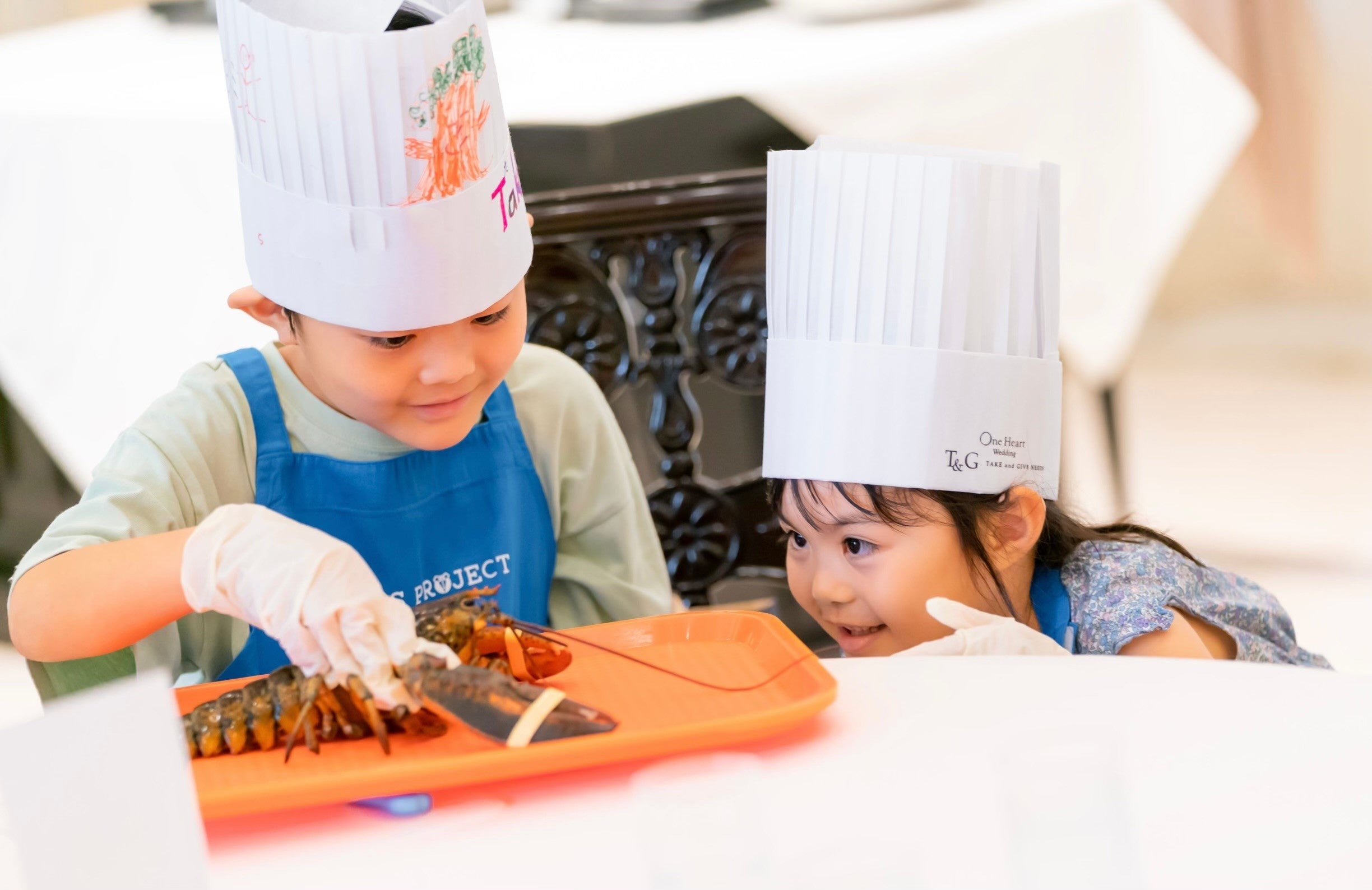 「食育体験」は、調理体験やシェフの講話を通して、料理の楽しさや調理方法はもちろん、フードロス問題、衛生問題について考えるきっかけを提供。結婚式の料理でもよく使われるオマール海老や魚を捌くプログラムでは命の大切さを、地域の特産品を調理するプログラムでは地産地消について学びます。