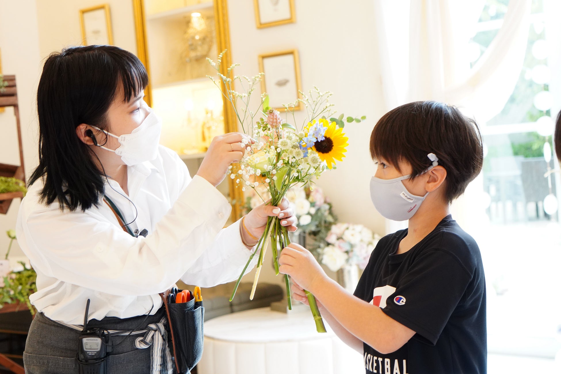 「仕事体験」では、結婚式場で働くフラワーコーディネーターやパティシエの仕事を体験することで働くことの楽しさを伝え、子どもたちの職業観を育みます。今年度はサステナビリティの視点からブーケづくりに「ロスフラワー」を使用。花市場で売れ残り、まだ美しい状態にもかかわらず廃棄される予定だった生花を活用して、資源を大切に使いごみを減らすことの大切さも伝えます。