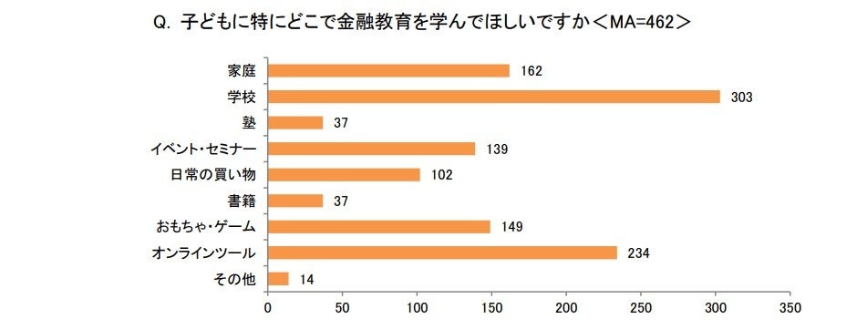 「子どもに特にどこで金融教育を学んでほしいですか<MA>」では、6割以上が「学校」(303)と回答し、教育ノウハウの整った場所での正しい学びが求められていることがわかります。一方で、2位に「オンラインツール」(234)、3位に「家庭」(162)が続いており、日常生活の中でも金融リテラシーを身につけてほしいという意見も見受けられます。