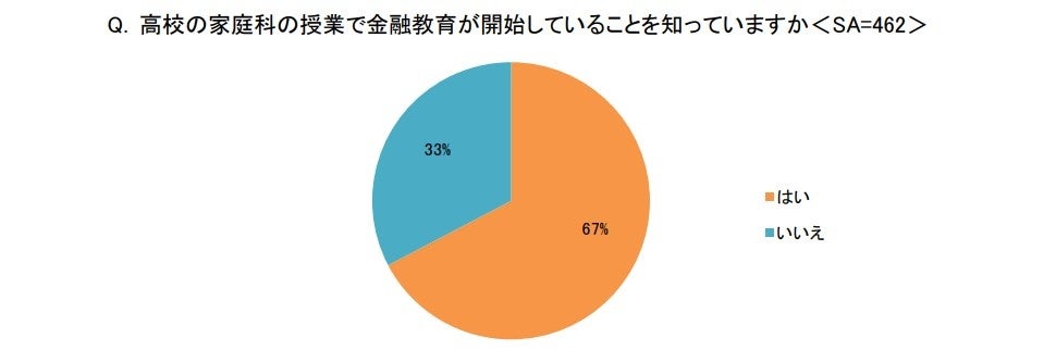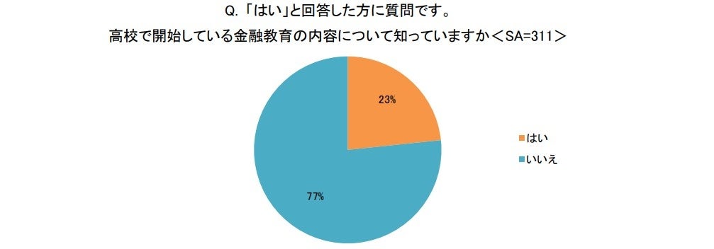 「高校の家庭科の授業で金融教育が開始していることを知っていますか<SA>」の問について、約7割が「はい」(311)と回答し、高校での金融教育導入の認知が拡大してきていることがわかります。その一方で、「はい」と回答した人に「高校で開始している金融教育の内容について知っていますか<SA>」と聞いたところ、「はい」(74)が2割程度にとどまりました。この結果から、学校で実施される金融教育の具体的な内容を知る人はまだ少なく、子どもが学ぶべき正しい金融教育はまだ認識されていないことがわかります。