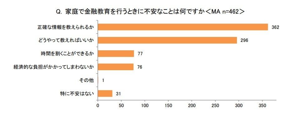 また、「家庭で金融教育を行うときに不安なことは何ですか<MA>」では、約8割が「正確な情報を教えられるか」(362)と答えました。家庭での金融教育に意欲はあるものの、その正解がわからないことに不安を感じており、親を対象とする正しい金融教育のニーズが伺えます。