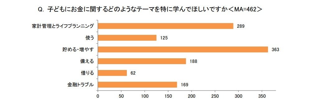 「子どもにお金に関するどのようなテーマを特に学んでほしいですか<MA>」という問で、「貯める・増やす」(363)が約8割と最も多く、「家計管理とライフプランニング」(289)が続きました。