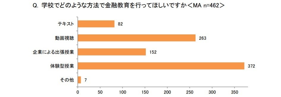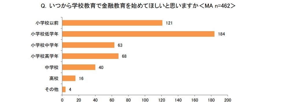 また、「いつから学校教育で金融教育を始めてほしいと思いますか<MA>」という問については、約4割が「小学校低学年」(184)と回答し最も多く、「小学校以前」(121)が続きました。高校での金融教育の導入は進むものの、親としては、小学校低学年以前での金融リテラシーを身につけてほしいと考えていることが伺えます。