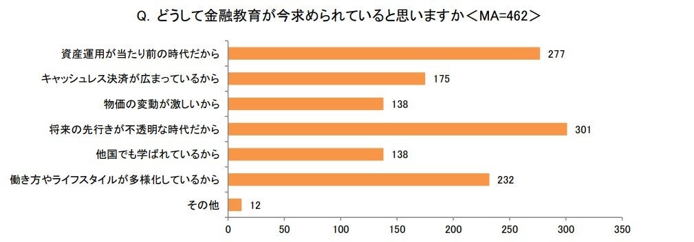 また、「どうして金融教育が今求められていると思いますか<MA>」の問では、1位に「将来の先行きが不透明な時代だから」(301)、続く2位が「資産運用が当たり前の時代だから」(277)、3位が「働き方やライフスタイルが多様化しているから」(232)となり、それぞれ半数以上の回答が集まりました。