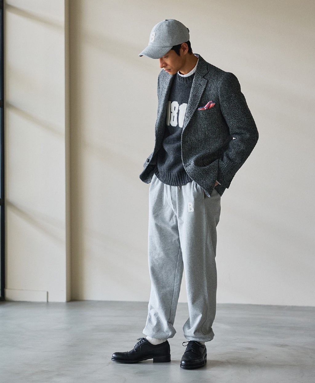 ジャケット¥108,900 セーター¥30,800 スウェットパンツ¥16,500 キャップ¥8,800 ポケットスクエア¥6,600(税込み価格)