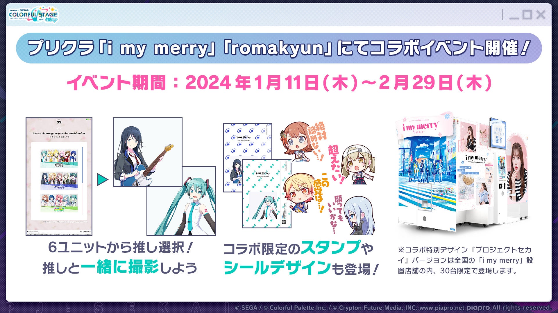 好評稼働中のプリクラ『i my merry』『romakyun』において、『プロジェクトセカイ カラフルステージ! feat. 初音ミク』との期間限定コラボを2024年1月11日(木)より開催します。