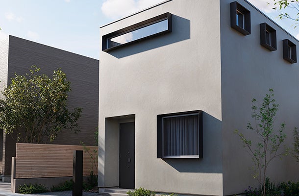 見付け幅(枠の細さ)を極限まで薄くしたスリムなデザインが特長です。海外建築で見られるような四方を囲む4つの設置方法により、立体感のある印象的なファサードを創出することができます。