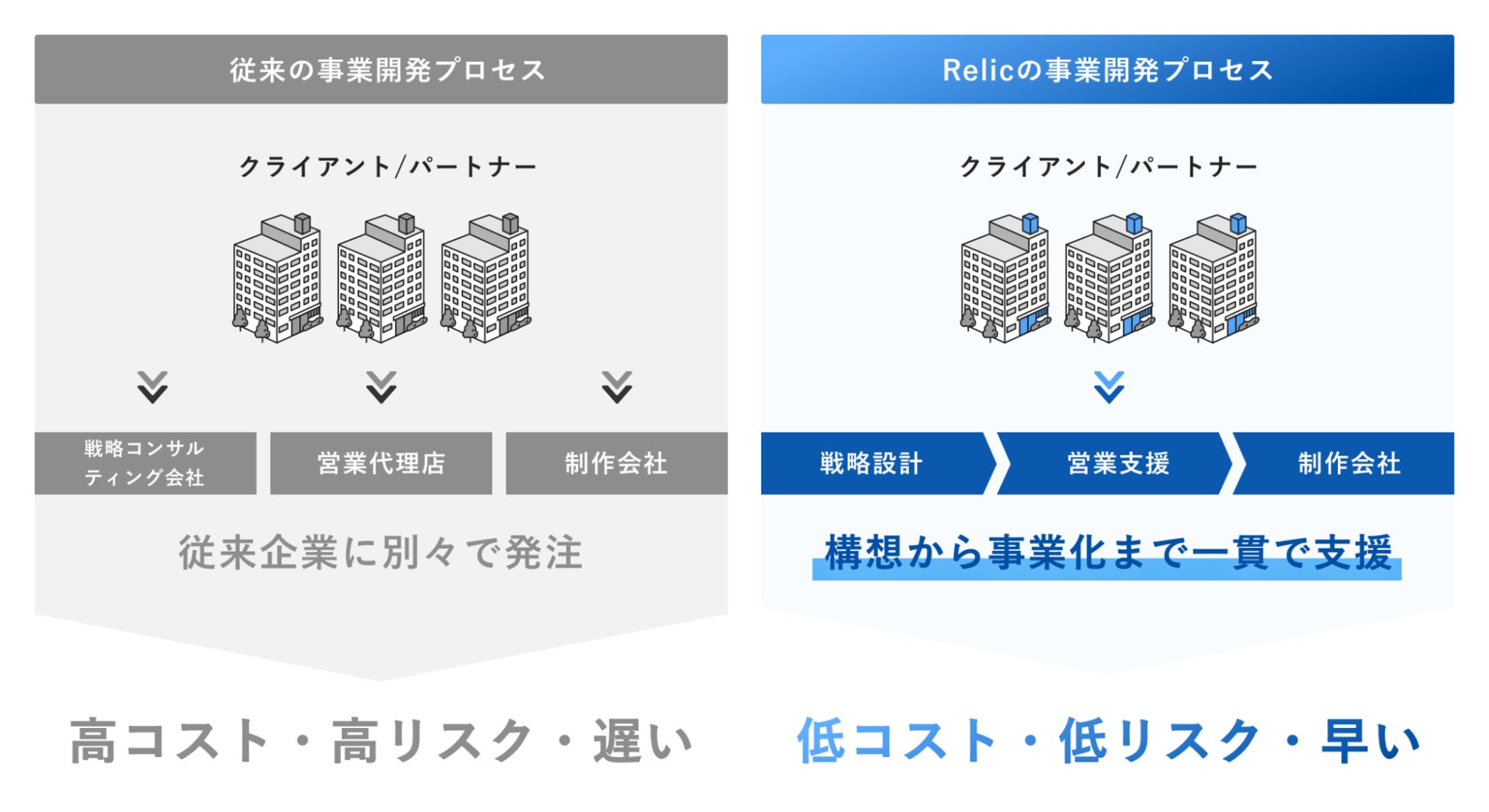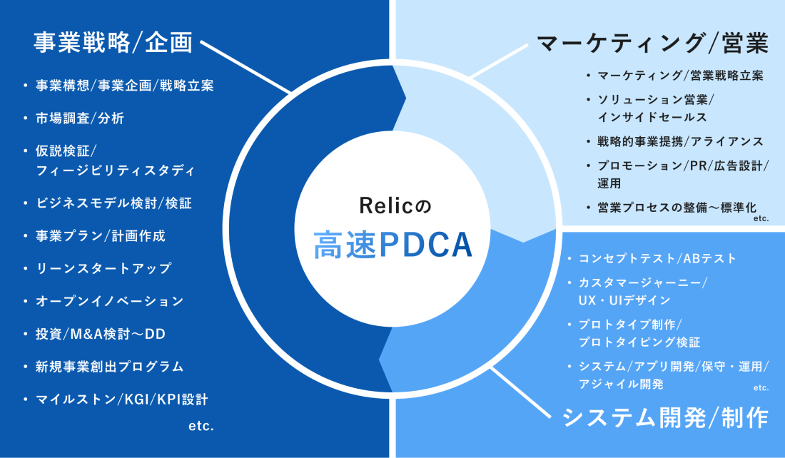Relicは、⽇本企業の新規事業開発やイノベーション創出を⽀援する「事業共創カンパニー」です。世界でも類を⾒ない新規事業開発に特化したSaaS型プラットフォームを提供する「インキュベーションテック事業」、総合的かつ⼀気通貫で新規事業やイノベーション創出を⽀援する「事業プロデュース/新規事業開発⽀援事業」、スタートアップ企業への投資や⼤企業との共同事業/JVなどを通じてイノベーションを共創する「オープンイノベーション事業」という3つの柱となる事業を統合的に展開してまいりました。創業から7年間の活動を通じて、4,000社・20,000件以上の新規事業開発に携わってきた実績も含め、新規事業やイノベーションの共創や⽀援の分野において唯⼀無⼆の価値と意義、そして業界トップクラスの規模や成⻑を実現してきたリーディングカンパニーです。