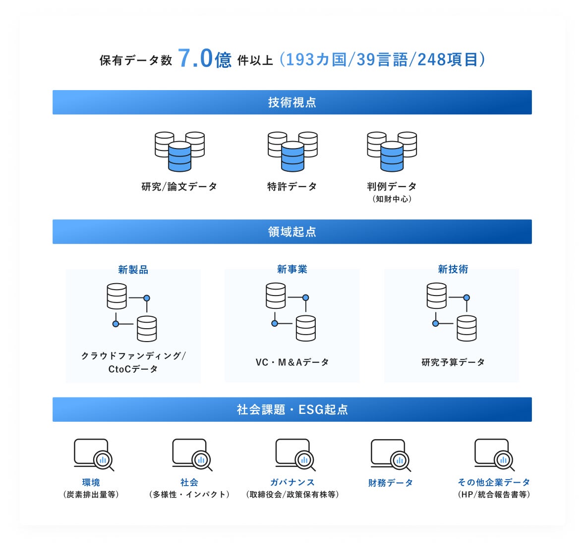 世界193ヵ国、39言語、7億件を超える世界最大級の無形資産/イノベーションデータベースを構築し、独自に定義した136の"成長領域"とSDGsに対応した人類が解決すべき105の"社会課題"に分類・分析。領域・企業・人の観点から高解像度な予測を機械的に導出するアルゴリズムを開発している。事業会社、金融機関/投資家、公的機関に対し、データを活用した新規事業やオープンイノベーション/M&A支援、無形資産/非財務に関するデータやスコアの販売、インパクト評価、技術分析/DD、未来推定、企業価値可視化などのサービスを提供している。社内専門家チームを有し、サステナビリティや脱炭素、中長期の未来予測や先端技術に関するプロジェクトを多数手がける。