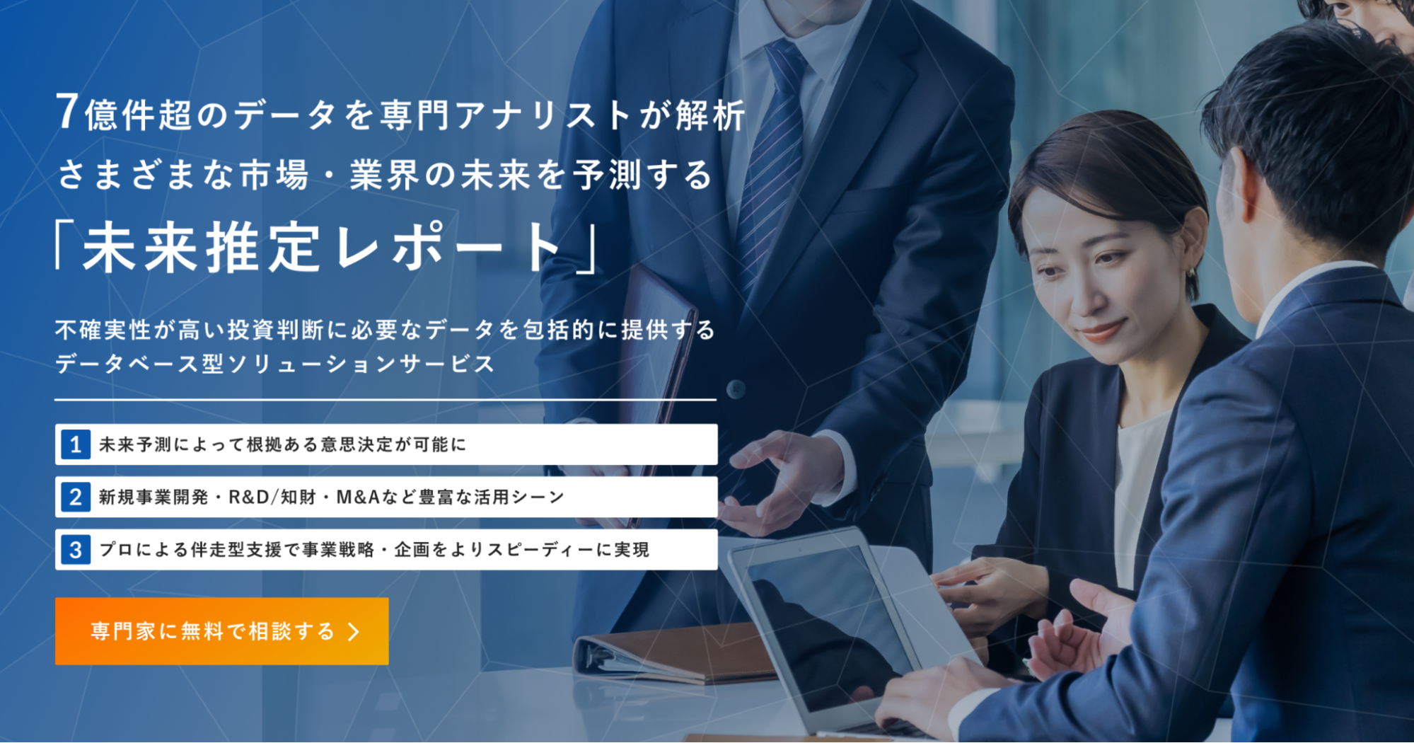 未来推定レポートは、アスタミューゼ社が保有する世界193ヵ国・7億件超のイノベーションキャピタルデータベースを用いて、様々な市場・業界の未来の動きを予測したデータベース型のソリューションサービスです。