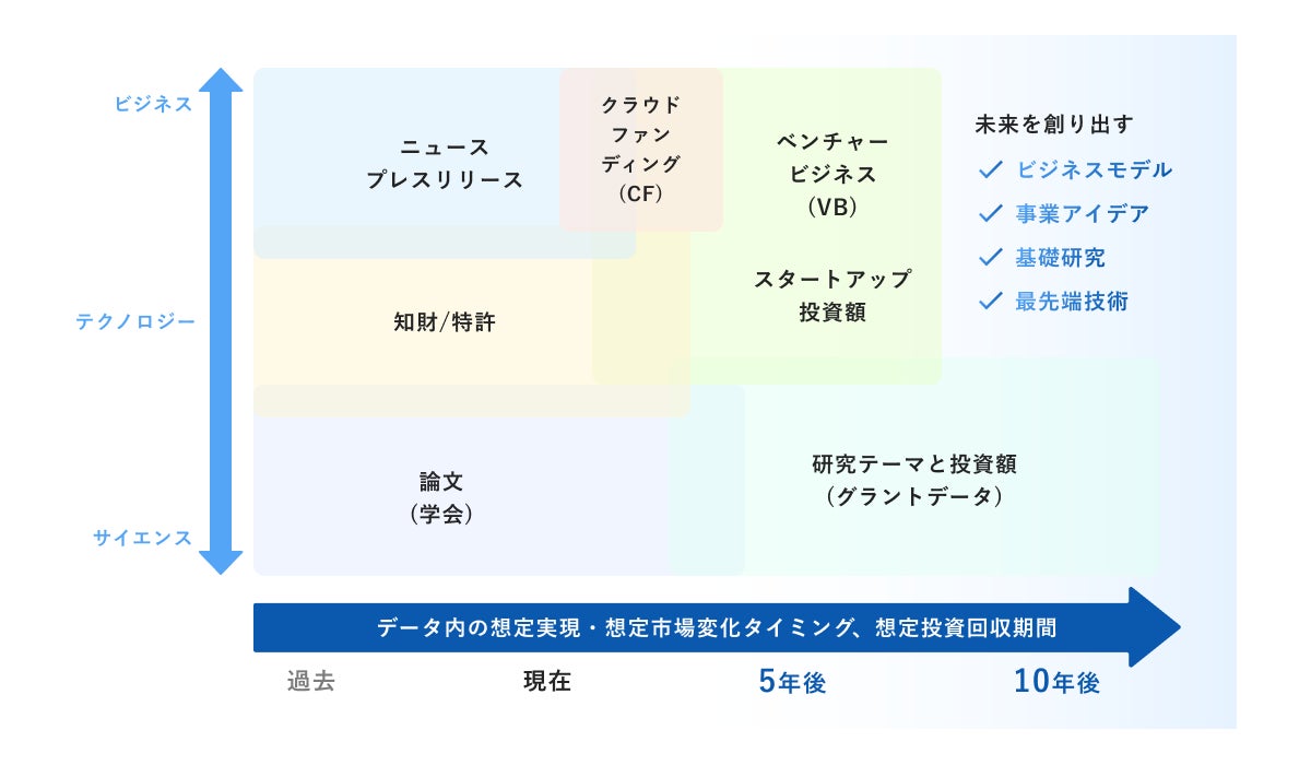 未来推定レポートは、総数7億件以上にも上る、知財/特許・論文・グラントデータ・VB/SU/CF等を取りまとめた世界最大級の独自データベースを用いて作られています。専門アナリストが対象領域・時間軸に応じてデータを使い分け、様々な時間軸・粒度での未来予測を可能にしています。