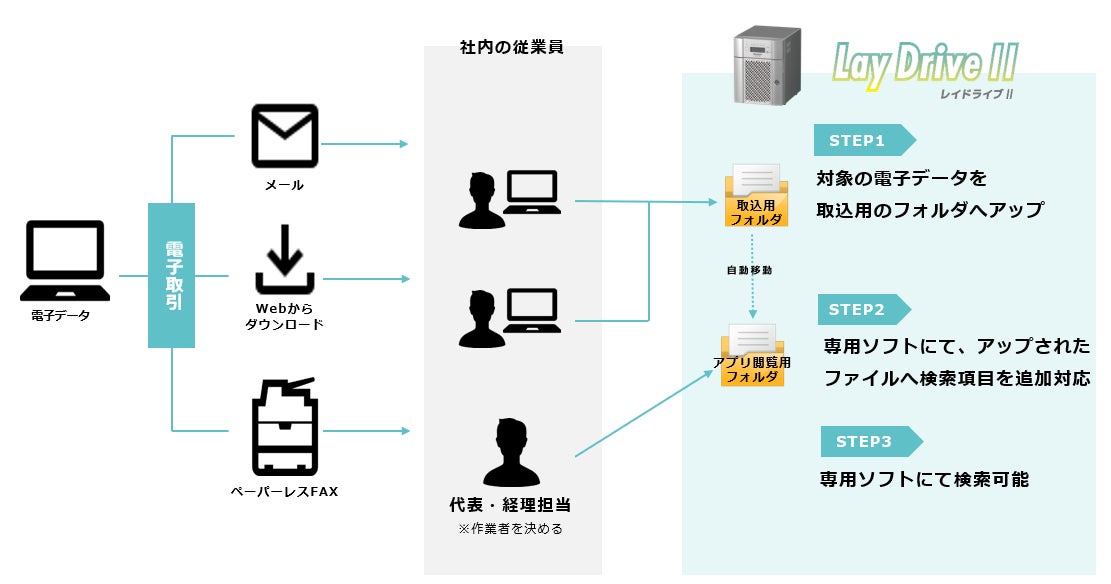 スターティアが提供するファイルサーバ・Lay DriveⅡと電子データの検索要件を満たしたCOCORO OFFICEの導入によって、電子取引における電子保存の義務化への対応を、簡潔なプロセスで迅速に実施できます。