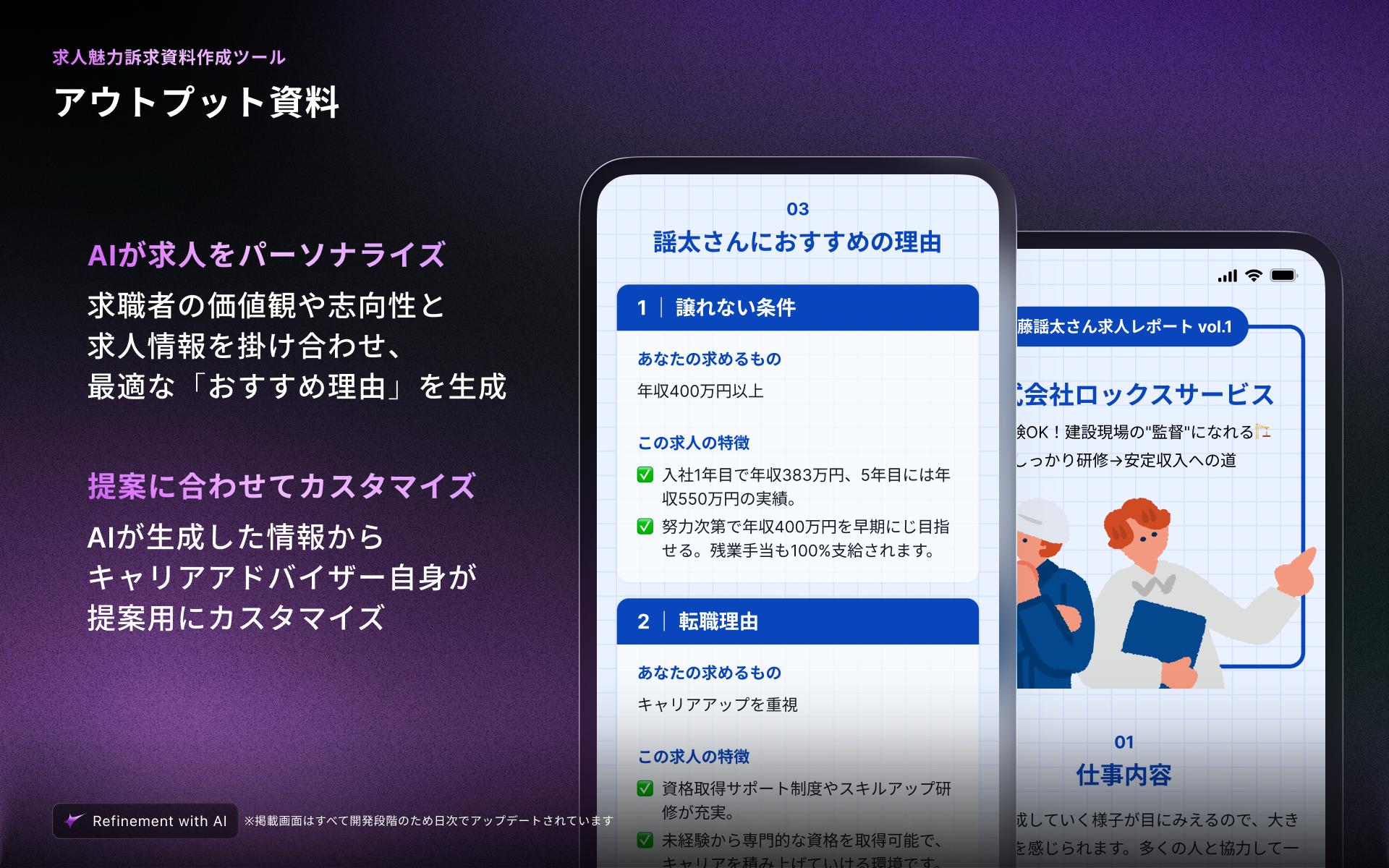 求人情報の中から、求職者の価値観や志向性に合致するポイントをAIが解析し要約。提案する内容はカスタマイズ可能で、説得力のある資料を瞬時に作成します。 -