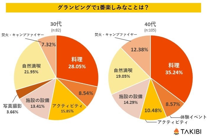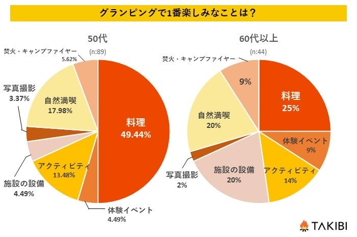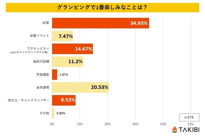 10代~60代の男女を対象とした「グランピングで1番楽しみなことは何ですか?」というアンケートで最も多かった回答は「料理」で全体の34.93%という結果になりました。