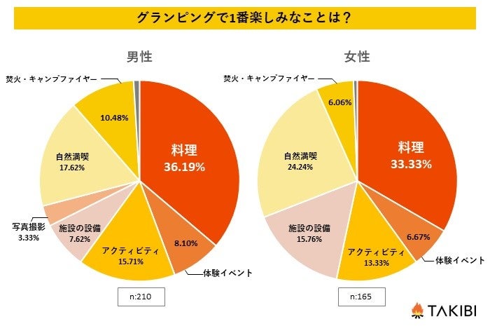 男女別で見てみると、「料理」が1番楽しみと答えた方が男女ともに最も多く、男性が36.19%、女性が33.33%という結果になりました。