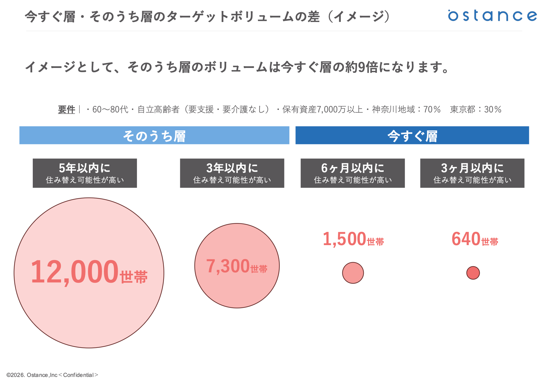 オースタンスは「5年以内に住み替えの可能性がある層」を約12,000世帯と推計。この「そのうち層」のボリュームは今すぐ層の約9倍に相当します。この大きな潜在層への早期接点化こそが、中長期的な成約最大化のカギと判断しました。
