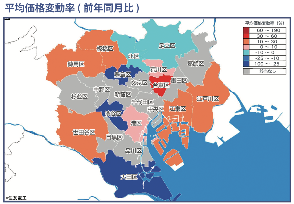 東京23区の平均価格・平均坪単価・平均面積・供給戸数を前年同月値と共に表にまとめ、平均価格の前年同月比で平均価格変動率を算出、ポリゴン表示しました。