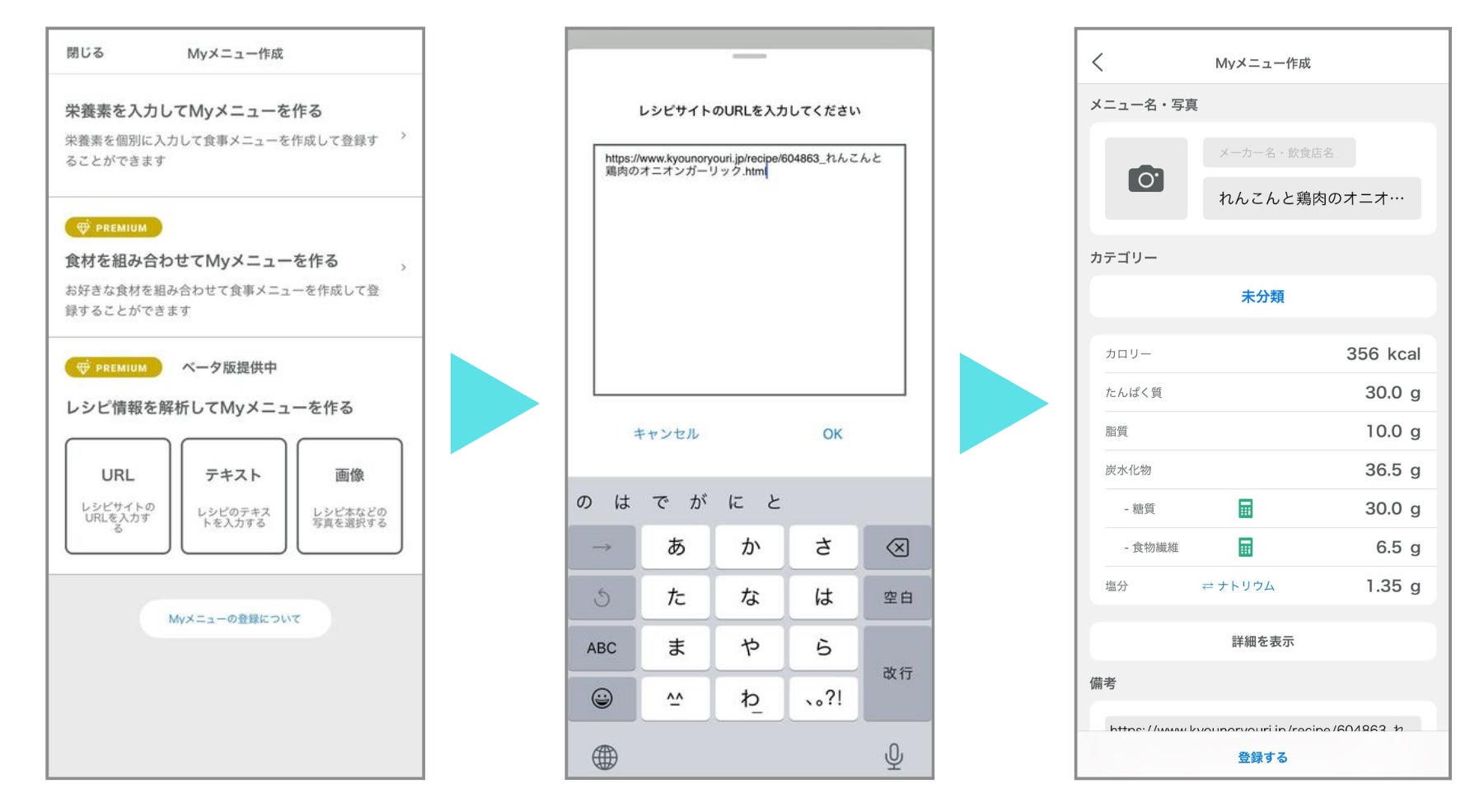これまでは「食材を組み合わせてMyメニュー作成機能」を使用すると食材を1つずつ分量を設定して組み合わせる必要がありましたが、本機能により、レシピが載っているサイトのURLやテキスト、食材の分量が載った画像を読み込めば、AIが自動で食材と分量を解析して栄養価計算し、Myメニューに登録できます。
