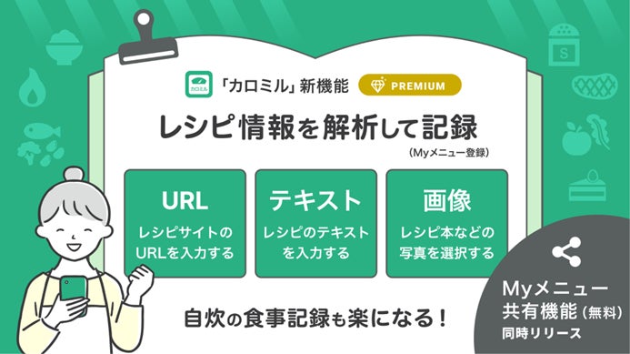 食事・運動・体重管理アプリケーション(以下アプリ)「カロミル」の開発・提供をするライフログテクノロジー株式会社(東京都中央区、代表取締役:棚橋繁行、以下当社)は、カロミル内に予め登録のないメニューを独自に作成できる「Myメニュー」に新機能「レシピからMyメニュー作成機能」と「Myメニュー共有機能」を追加するアップデートを行ったことをお知らせします。