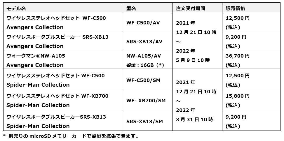 ソニーマーケティング株式会社は、MARVEL(マーベル)のスーパーヒーロー「アベンジャーズ」、「スパイダーマン」を特別にデザインしたワイヤレスヘッドホン、ワイヤレススピーカー、ハイレゾ対応ウォークマン®の注文受付を開始します。「アベンジャーズ」デザインモデルの受付期間は本日12月21日(火)午前10時から2022年5月9日(月)10時まで、「スパイダーマン」デザインモデルの受付期間は本日12月21日(火)午前10時から2022年3月31日(木)10時までとなります。本モデルは受注生産品となっており、お届け時期目安についてはソニーストアの商品購入Webサイトにて表示いたします。