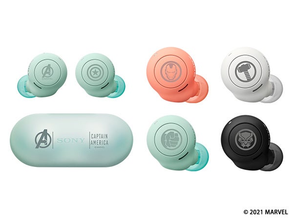 ・本体のイヤホン部分および付属の充電ケースに「アベンジャーズ」のモチーフを刻印したデザインで、5人のヒーロー(「キャプテン・アメリカ(カラー:アイスグリーン)」「アイアンマン(カラー:コーラルオレンジ)」「ソー(カラー:ホワイト)」「ハルク(カラー:アイスグリーン)」「ブラックパンサー(カラー:ブラック)」)から1つをお選びいただけます。