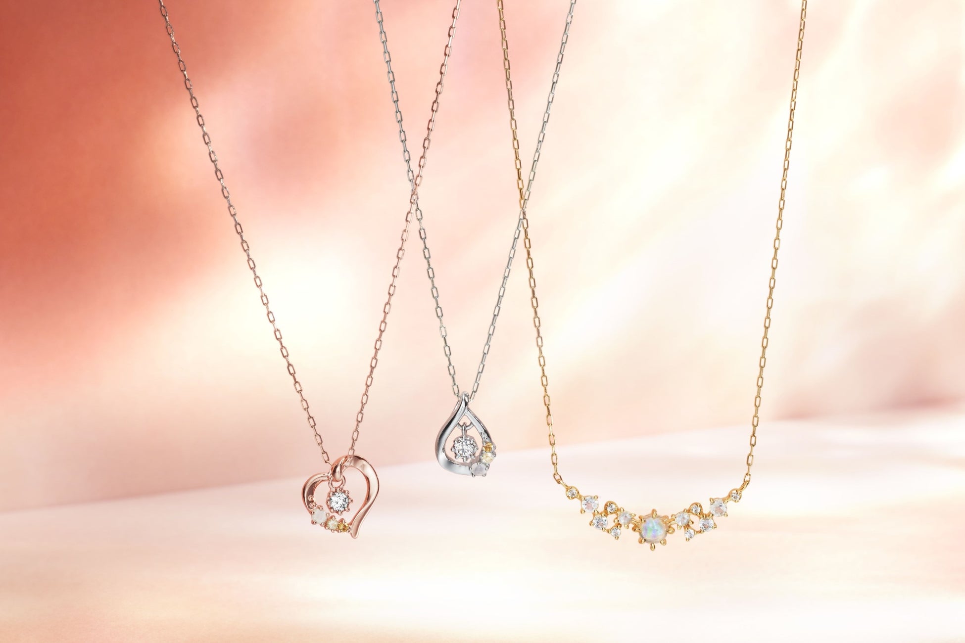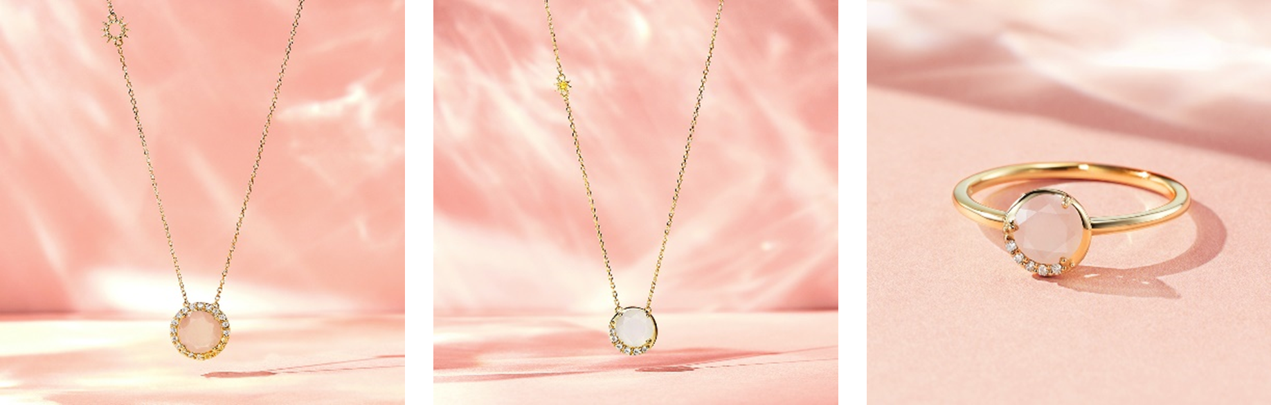 ハートやしずくなどの4℃の人気モチーフに、太陽の輝きをまとったムーンストーンやオパールをプラスし、特別感のあるデザインに仕上げた限定ジュエリーも登場。夏のトレンドであるボールドカラーに合わせて、今年らしい装いを楽しんでみては。