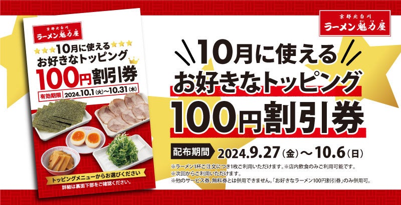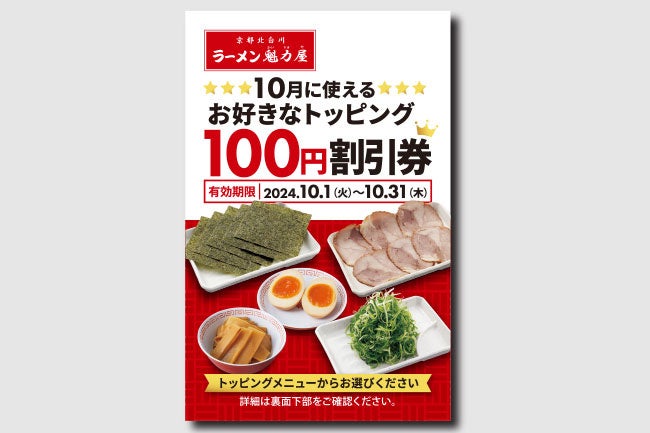 ラーメン魁力屋では、9月27日(金)よりご来店いただいたお客様に「お好きなトッピング100円割引券」を配布いたします。