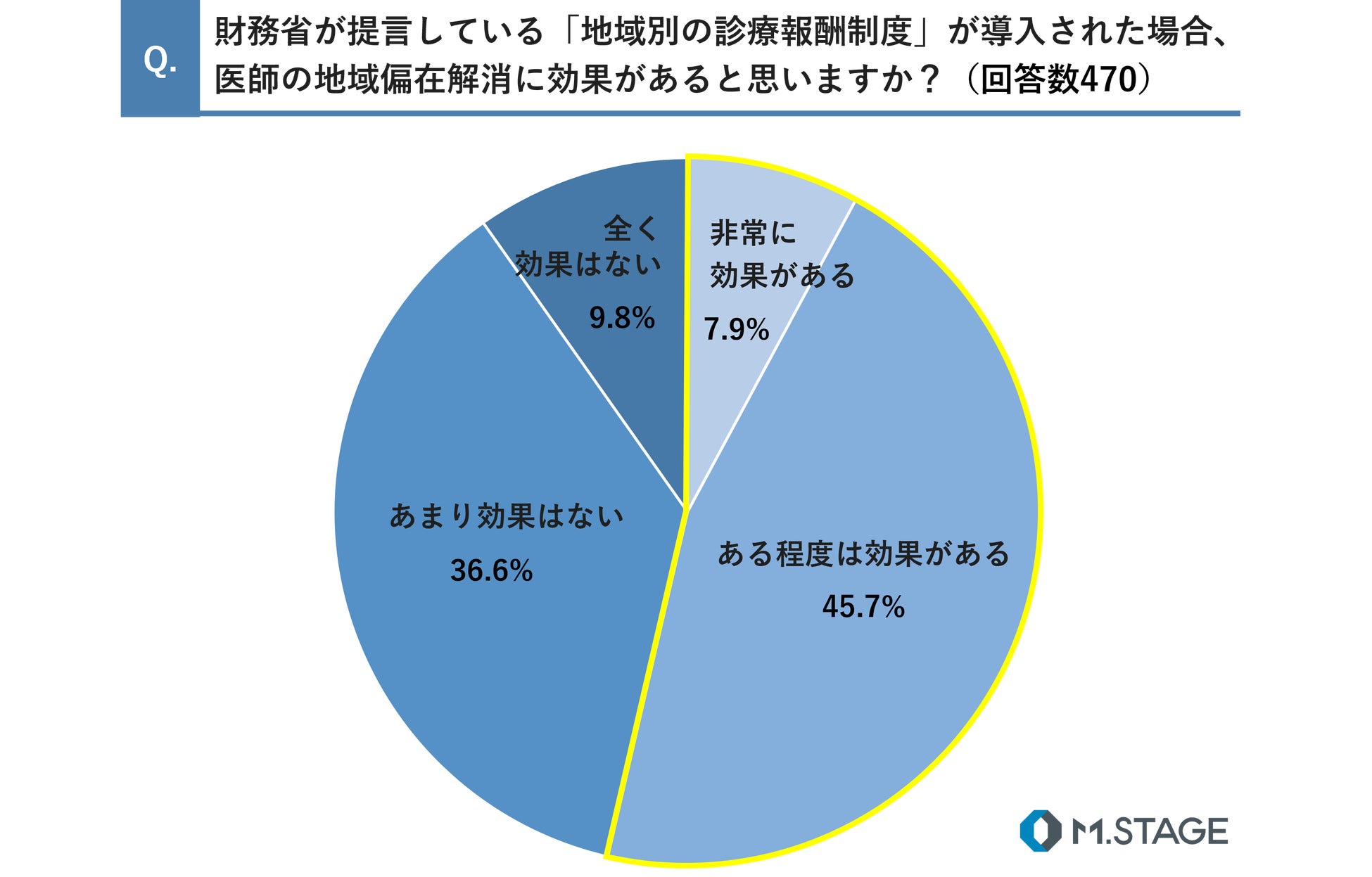 財務省が提言する「地域別の診療報酬制度」が導入された場合の、医師の地域偏在解消への効果に対する考えについて、「非常に効果がある」と回答した医師は7.9%、「ある程度は効果がある」と回答した医師は45.7%となり、半数以上の医師が効果があると考える結果となりました。