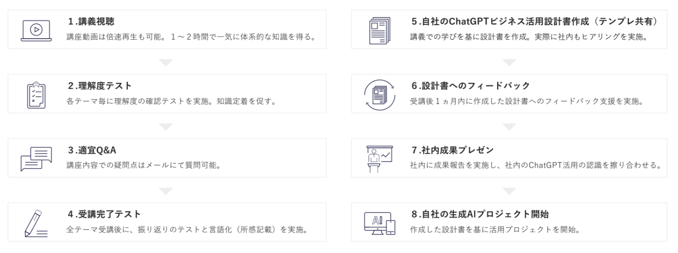 そのために、動画視聴のみではなく、各テーマごとの理解度テストや適宜Q&A、受講後完了テスト、そして実際にChatGPTビジネス活用設計書を作成していただき、フィードバックまで実施いたします。