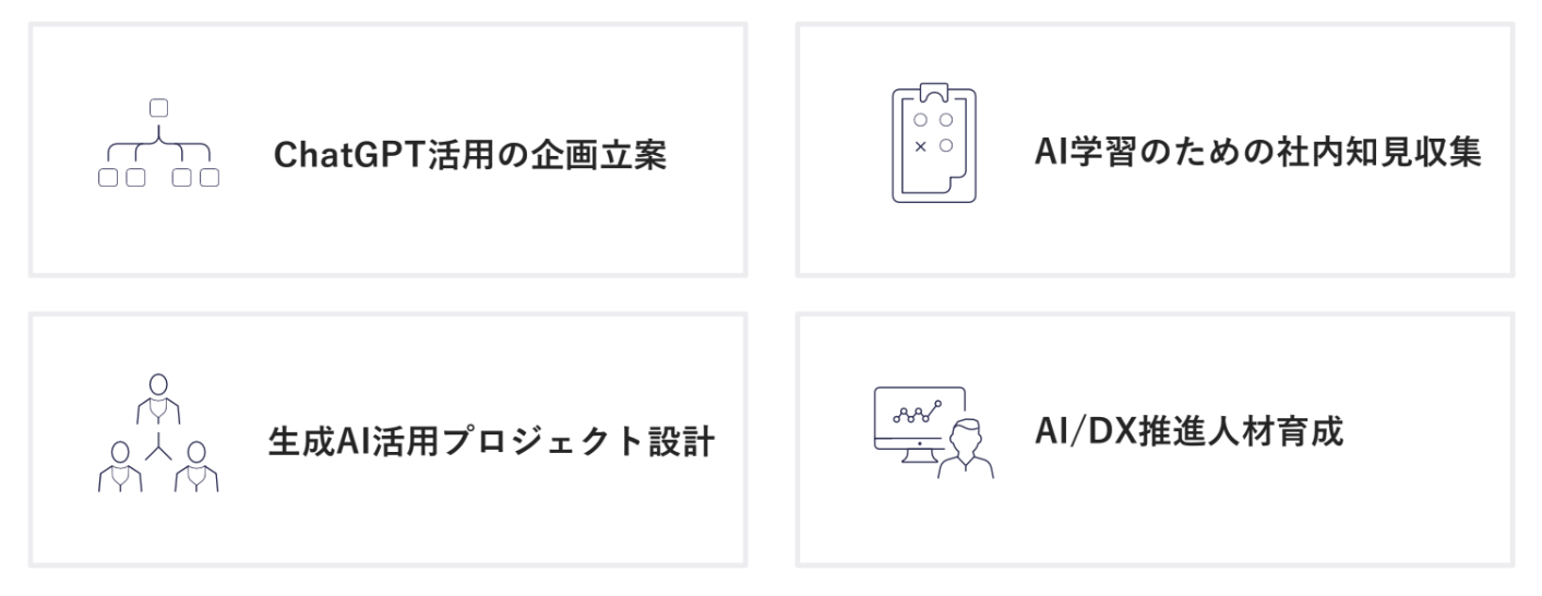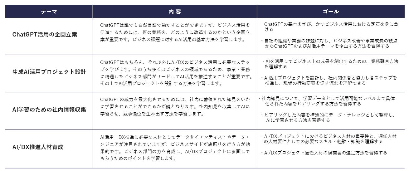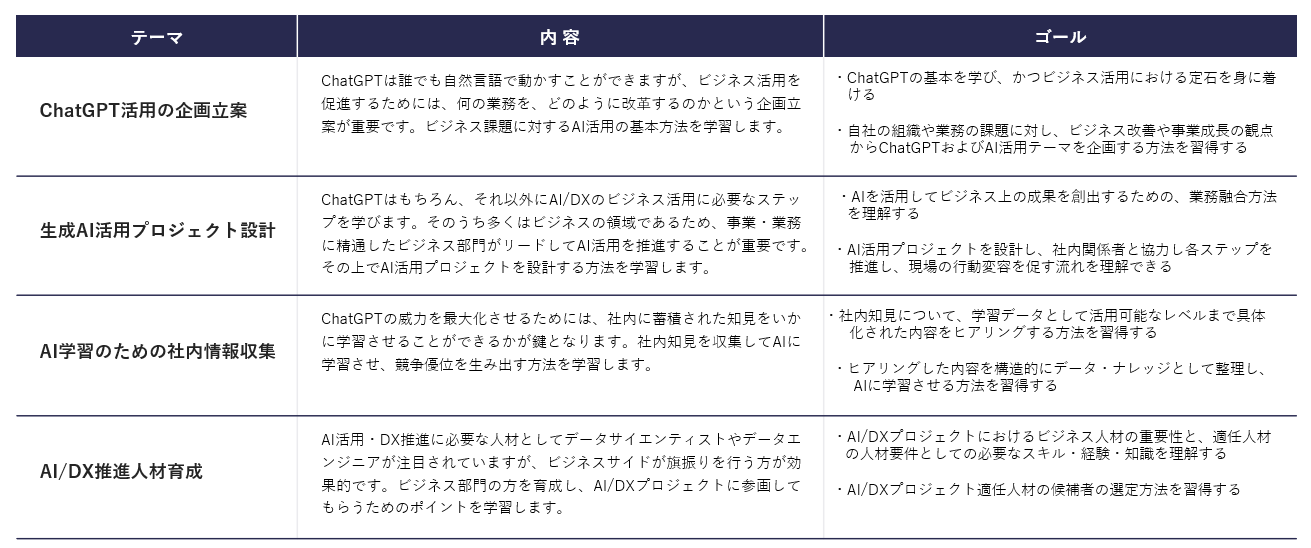 「ChatGPT活用の企画立案」「生成AI活用プロジェクト設計」「AI学習のための社内知見収集」「AI/DX推進人材育成」の4つのテーマの内容とゴールは下記です。