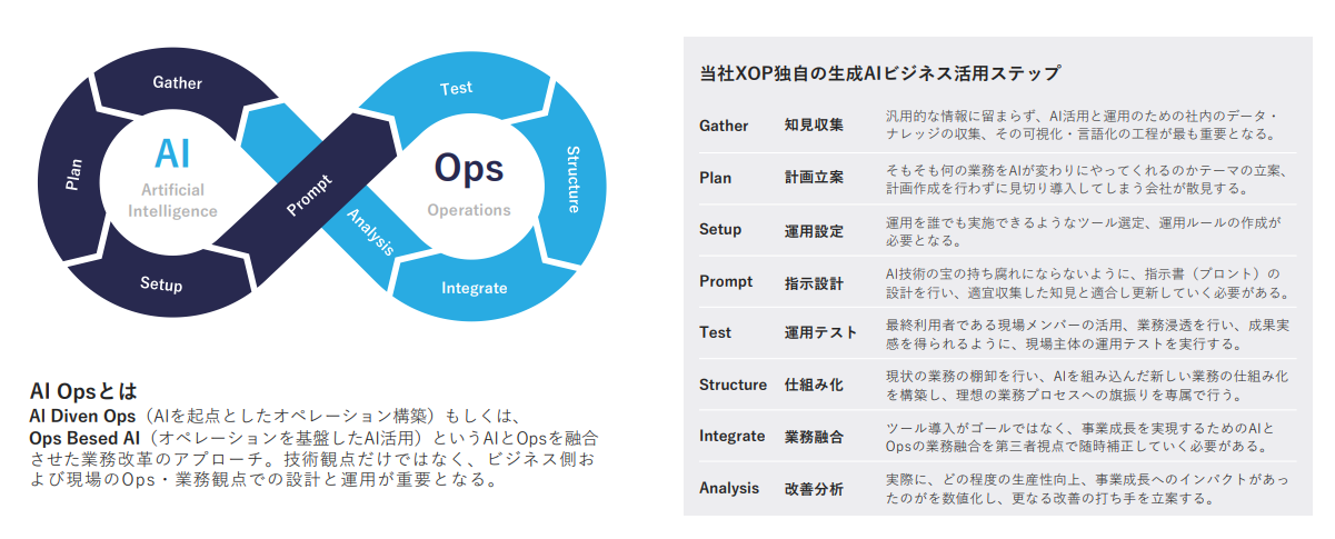 当社XOPは、Al Diven Ops(AIを起点としたオペレーション構築)もしくは、クライアント企業の状況に応じて、Ops Besed AI(オペレーションを基盤したAI活用)というAIとOpsを融合させた業務改革のアプローチを取っています。技術観点だけではなく、ビジネス側および現場のOps・業務観点での設計と運用が重要となります。