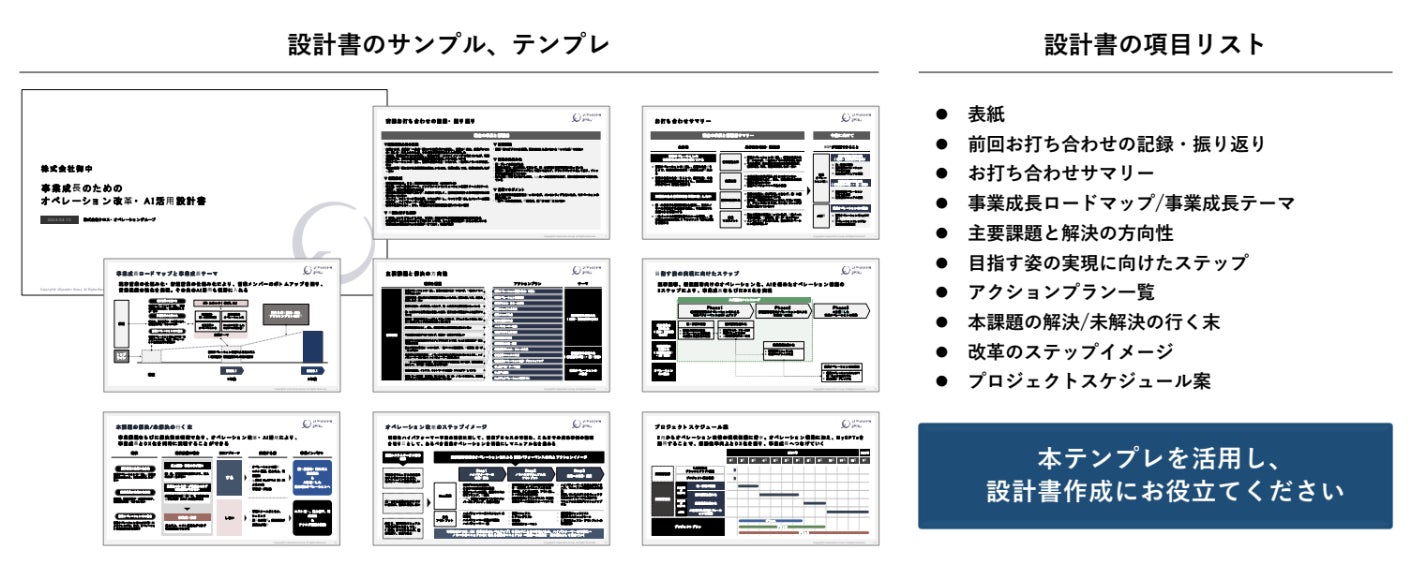 本講座のゴールである、自社のChatGPTビジネス活用設計書を作成するために、講座内の資料120ページ以上を共有するだけではなく、実際に当社XOPが各プロジェクトで作成してきた設計書のパワーポイントデータを共有いたします。