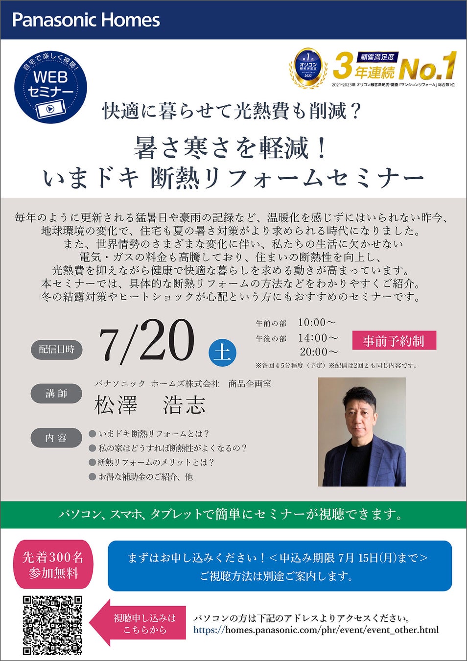 パナソニック ホームズ株式会社のグループ会社、パナソニック リフォーム株式会社は、光熱費を抑え、健康で快適に暮らすためのリフォーム方法をわかりやすく解説する『暑さ寒さを軽減!いまドキ 断熱リフォーム』WEBセミナーを、7月20日(土)10:00-10:45/14:00-14:45/20:00-20:45に開催します。