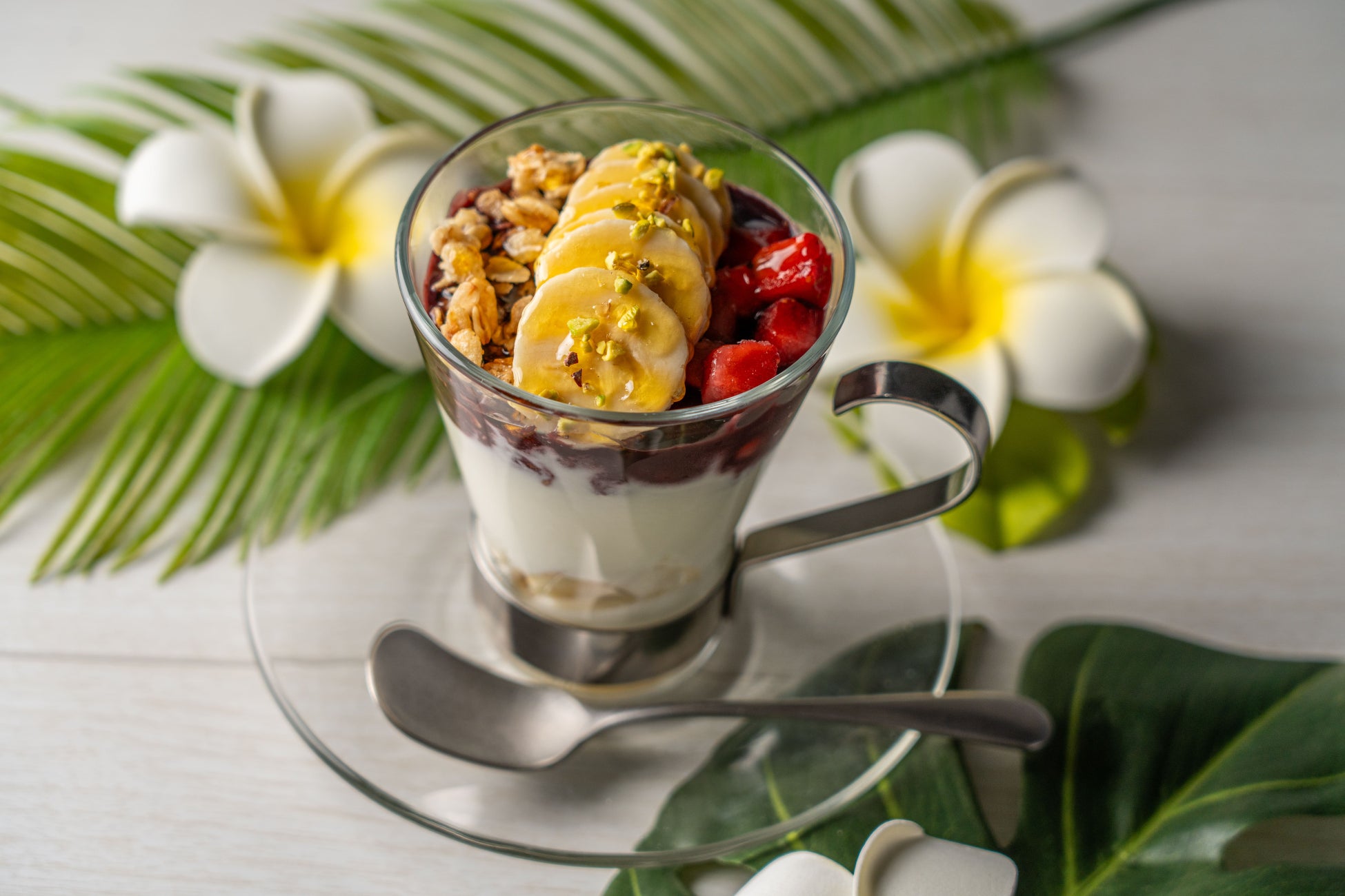 ヨーグルトとグラノーラに栄養価の高いアサイーをたっぷりと注ぎ、冷凍ストロベリー、バナナをトッピング。はちみつをかけて食べるヘルシースイーツです。これからの季節に爽やかな1品を、おやつや朝食としてぜひお楽しみください。