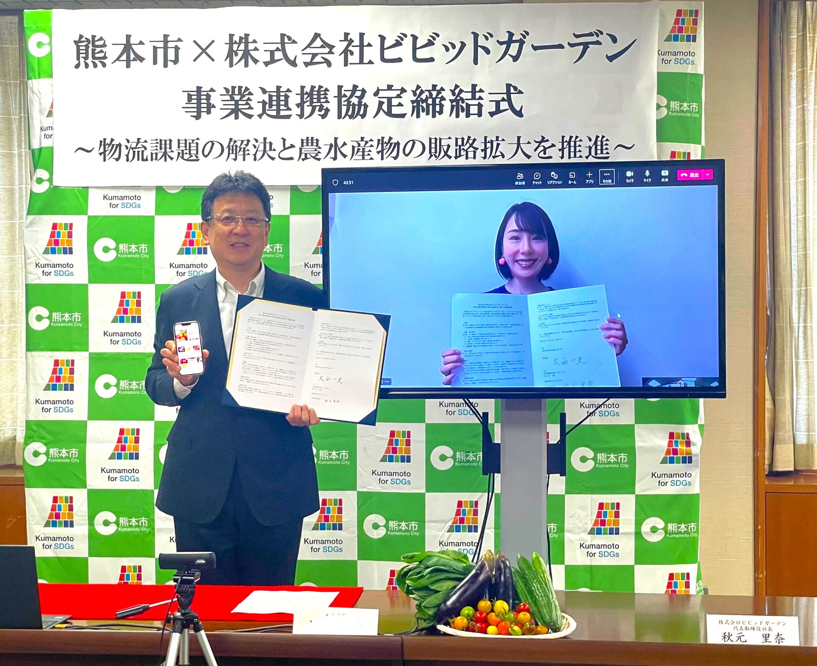 認知度・利用率など9つのNo.1(※1)を持つ日本最大の産直通販サイト「食べチョク」を運営する株式会社ビビッドガーデン(本社:東京都港区、代表取締役社長:秋元里奈)は、2022年8月25日(木)に熊本県熊本市と事業連携協定を締結しました。熊本市内に、生産者が集荷・出荷できる物流拠点を設置し、生産者の出荷作業の負荷を軽減することで、生産者が今まで以上に生産に集中できる環境の構築を目指します。
