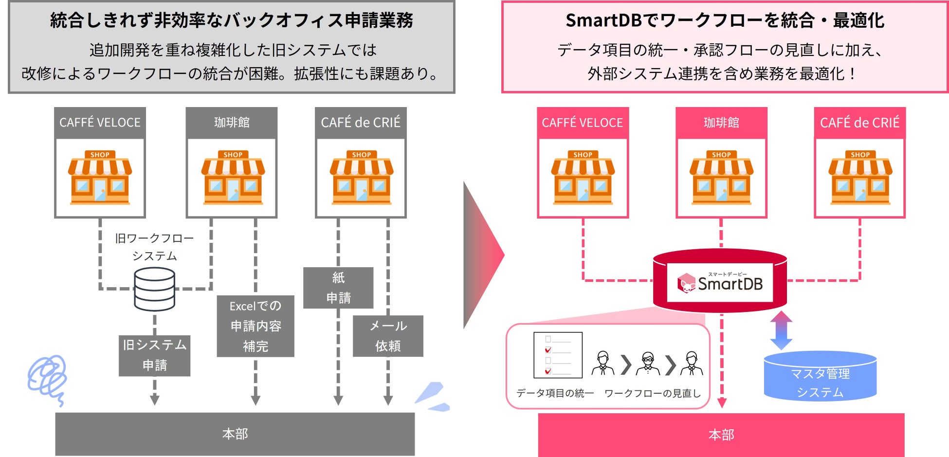 同社は経営統合にあたり、ブランドごとに異なるオペレーションでおこなわれていたバックオフィス業務の統一に取り組んでいました。 当初は統合前の株式会社シャノアールで利用していた既存ワークフローシステムへの統一も検討。 しかし、追加開発を重ねていたため改修が困難であることに加え、システムPMIのなかで新規導入するシステムとの連携ができないといった課題もありました。 また現行の情報システム部門によるシステム改修だけでは現状把握に時間がかかり、スピーディーに現場からの要望に応えられない状況でした。