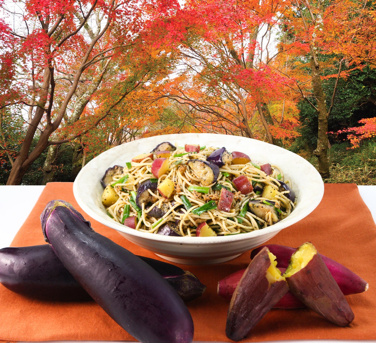 ▲「さつまいもと揚げなすの黒ごま担々パスタ」