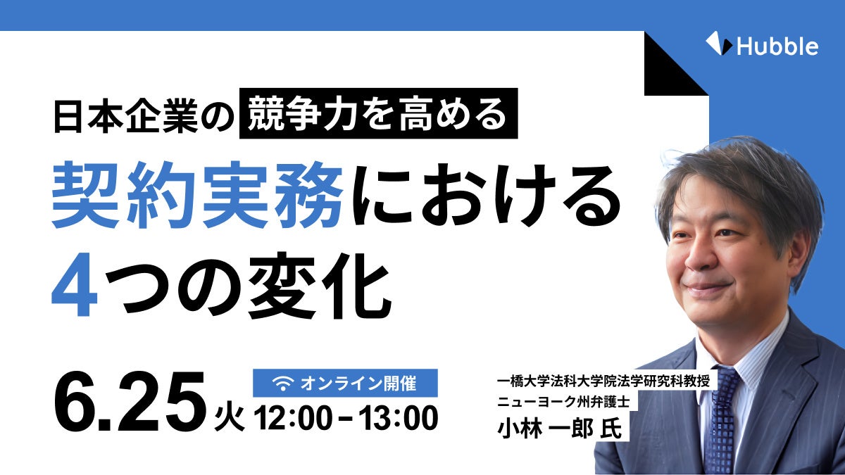 法務と事業部門の協業性を高める契約業務・管理クラウドサービス「Hubble(ハブル)」を提供する株式会社Hubble(東京都渋谷区、CEO:早川晋平)は、2024年6月25日(火)12:00-13:00にて、一橋大学法科大学院法学研究科教授/ニューヨーク州弁護士 小林 一郎氏をお迎えし、「日本企業の競争力を高める、契約実務における4つの変化」と題したセミナーを開催いたします。本セミナーは事前登録制・オンライン配信です。
