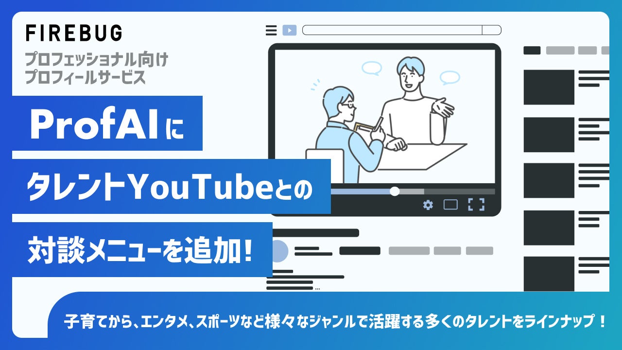 「タレント」を軸としたエンターテインメントを企業と共創する株式会社FIREBUG(本社:東京都渋谷区、代表取締役 CEO:佐藤詳悟 以下当社)は、プロフェッショナル向けプロフィール作成サービス「ProfAI」に、著名なタレントや経営者が運営するYouTubeチャンネルでの対談を実施する新メニューを2024年4月2日(火)より追加します。