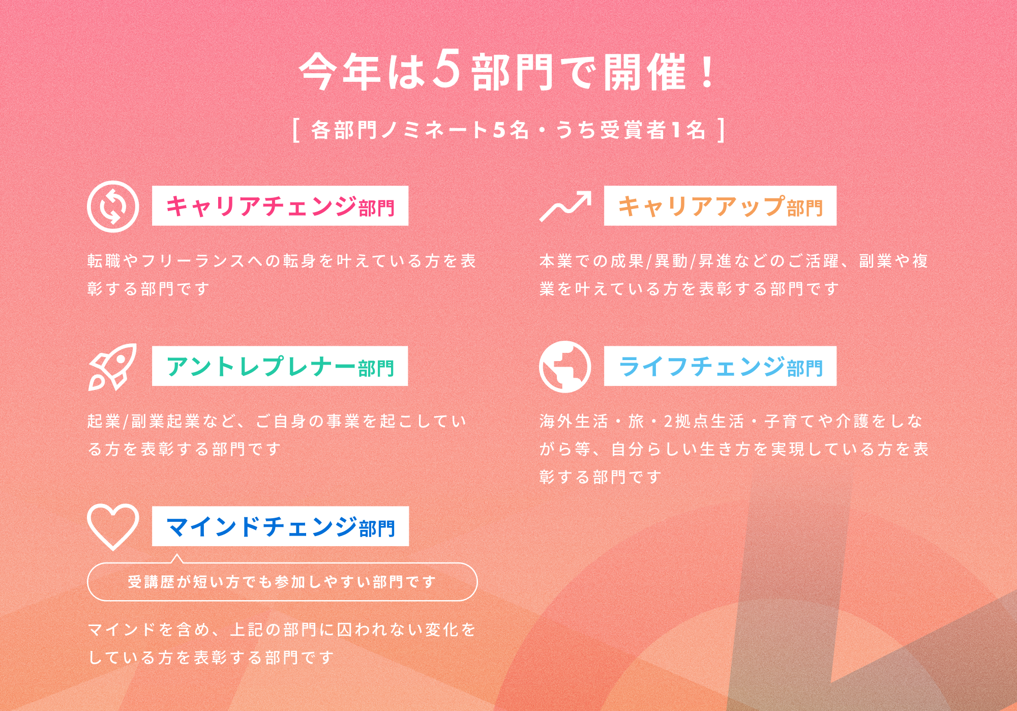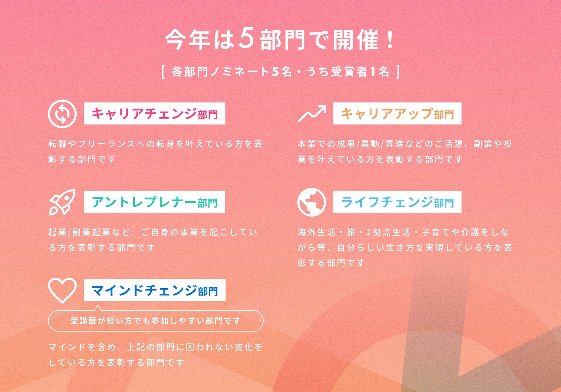 転職やフリーランスへの転身を叶えている方を表彰する部門です