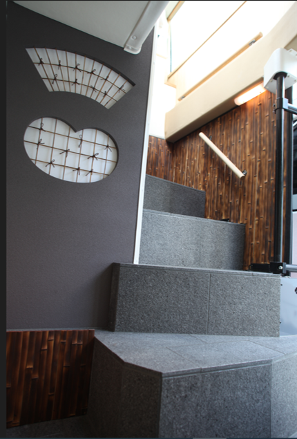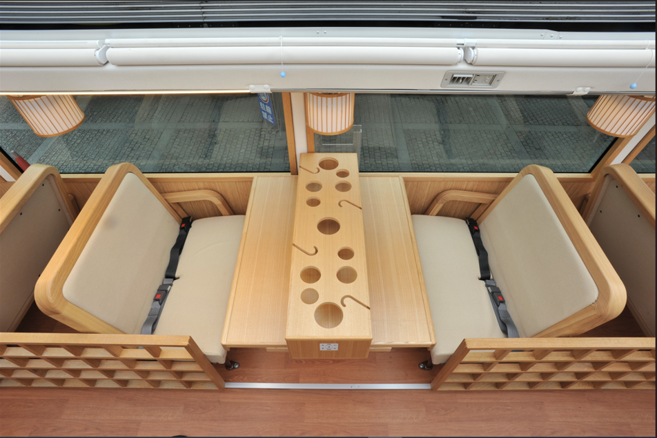 京都レストランバスの外装は、京都の景観に合わせた和テイストのイラストでデザインしており、内装は本物の石でできた階段や行灯をあしらい、格子や木をふんだんに使うなど、「老舗料亭」のような和の落ち着いた空間になっています。