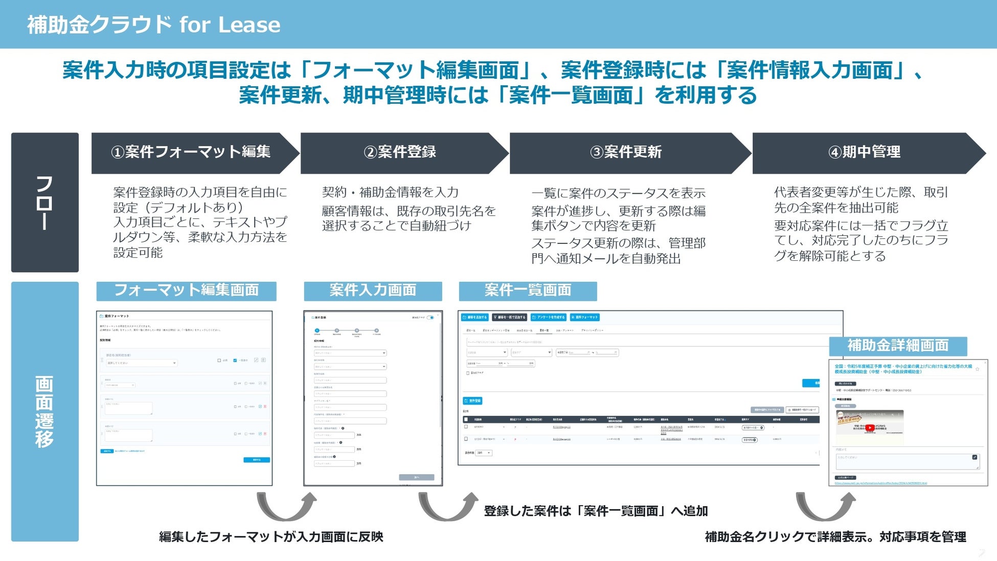 「補助金クラウド」は補助金支援のDXを通じた経営支援サービスとして、これまでも金融機関を中心に導入が進んでおりました。そのような中で、中堅・中小企業にとって財務や管理面からメリットの多いリースへの需要は高く、補助金との親和性が高いことからこれまでもみずほリース社や東京センチュリー社、三井住友トラスト・パナソニックファイナンス社、東銀リース社などに導入いただくなど、連携を進めてまいりました。