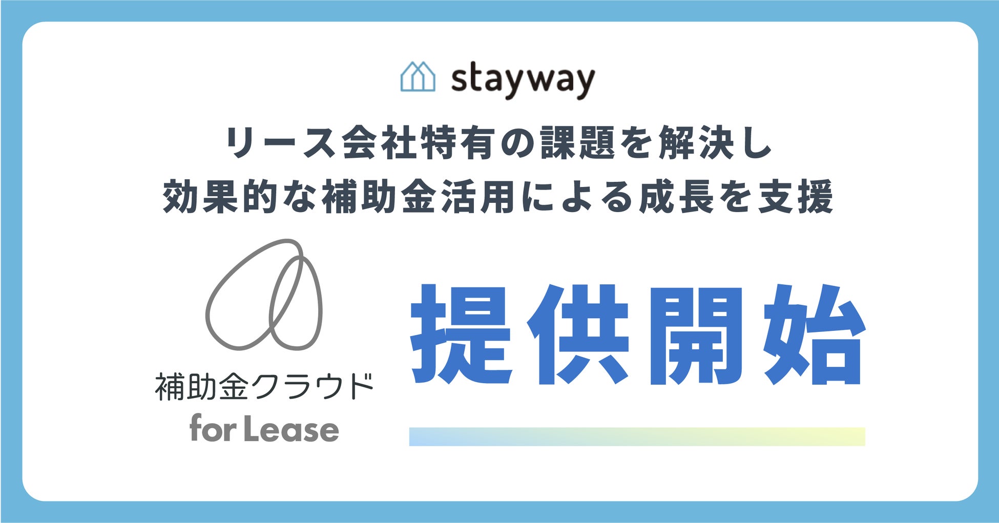 補助金支援のDXを通じた経営支援サービス「補助金クラウド」「前ほじょくん(補助金債権の早期資金化)」を運営する株式会社Stayway(本社:大阪府大阪市、代表取締役: 佐藤 淳、以下「Stayway」)は、リース会社における案件登録・更新業務及び期中管理業務の煩雑性を解決する「リース案件管理サービス」と「補助金クラウド」を組み合わせた新たなBPaaSサービス(※)「補助金クラウド for Lease」の提供を開始します。金融機関のみならず、中堅・中小企業の成長を支援する様々なビジネスとの連携を強化し、中堅・中小企業のデータプラットフォーム構想の推進を目指してまいります。