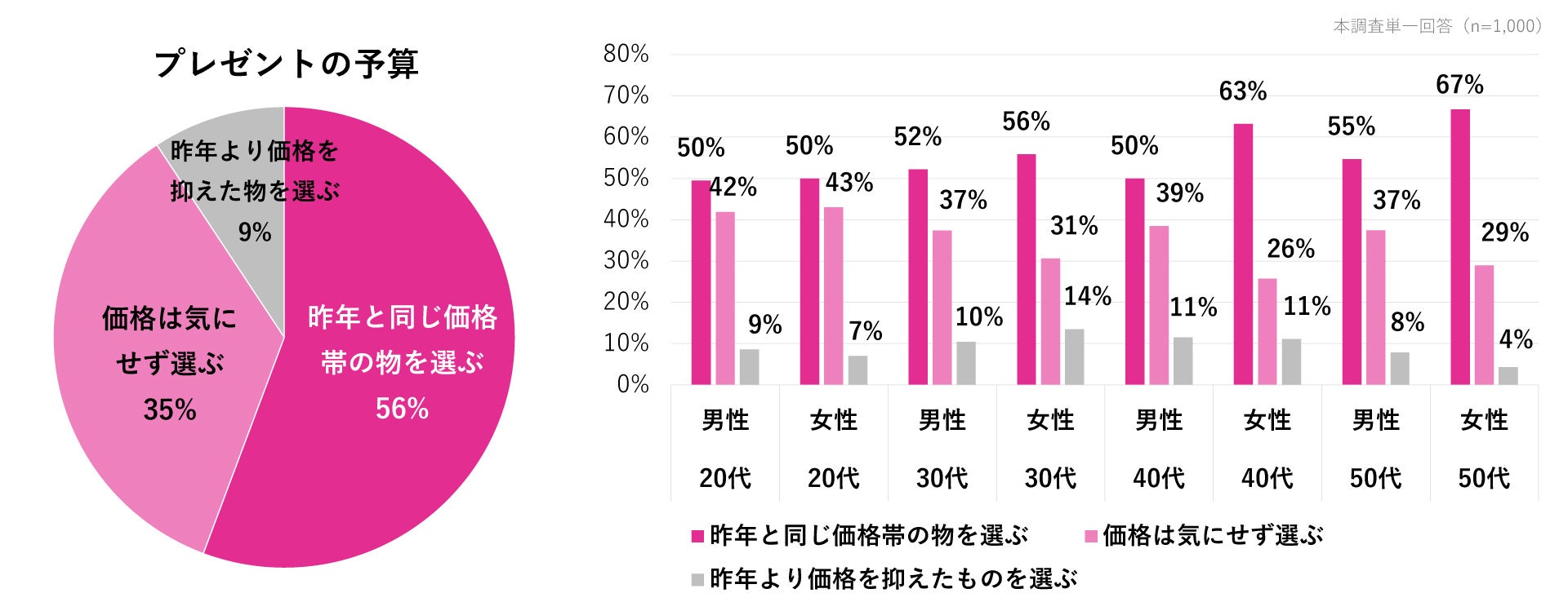プレゼントの価格について聞いたところ、「昨年より価格を抑える」と回答した人は約1割という結果に。