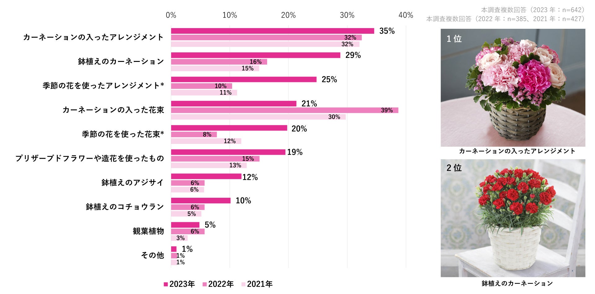 母の日のカーネーションは不動の人気!2023年はすぐに飾れるアレンジと鉢が上位を占める