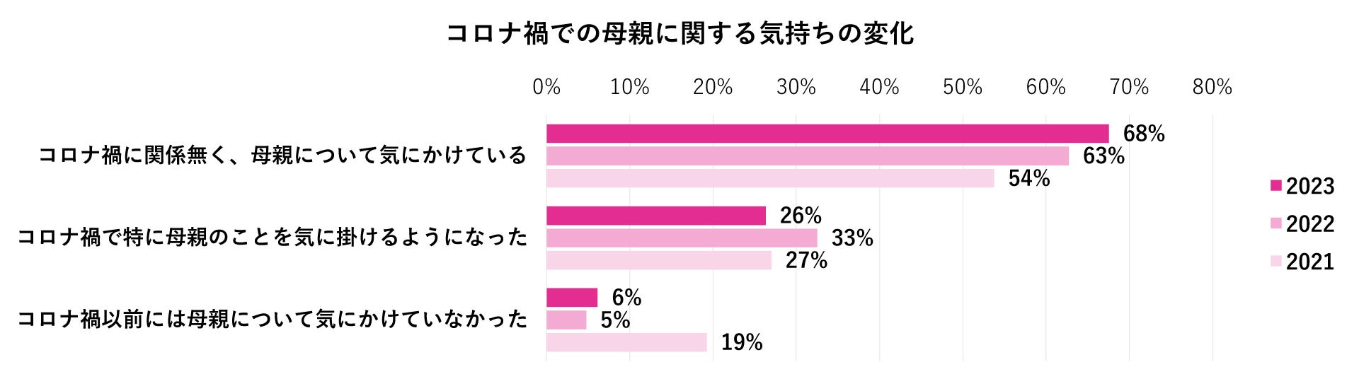 この結果からコロナ規制緩和から人と会うことの意識が変わってきたことがうかがえます。また、コロナ禍に関係なく母親について気にかけている人と回答した人は68%となり、調査を開始した2021年と比べると14ポイント増加しました。