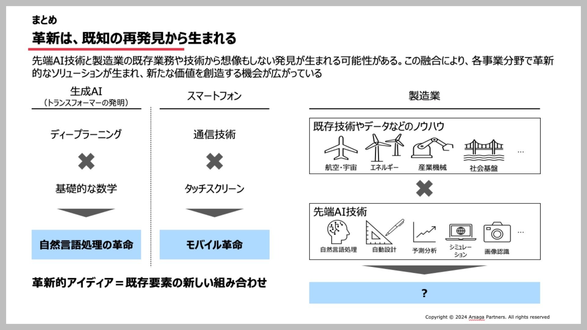 生成AIやディープラーニングが自然言語処理の革命をもたらしたように、通信技術とタッチスクリーンの融合がモバイル革命を起こしました。同様に、製造業では既存技術やデータのノウハウと先端AI技術が組み合わせることで、新たな革新の可能性が期待されています。新しい価値を生み出す鍵は、既存要素の革新的な組み合わせにあります。