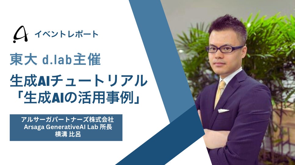 企業のDXを推進するアルサーガパートナーズ株式会社(本社:東京都渋谷区、代表取締役社長 CEO/CTO:小俣泰明、以下「アルサーガパートナーズ」)は、2024年9月11日(水)、東京大学大学院工学系研究科附属システムデザイン研究センター(d.lab)主催の「d.lab 協賛事業 生成AIチュートリアル」に、アルサーガパートナーズの生成AI研究チーム、Arsaga GenerativeAI Lab所長 横溝が登壇したことをお知らせいたします。