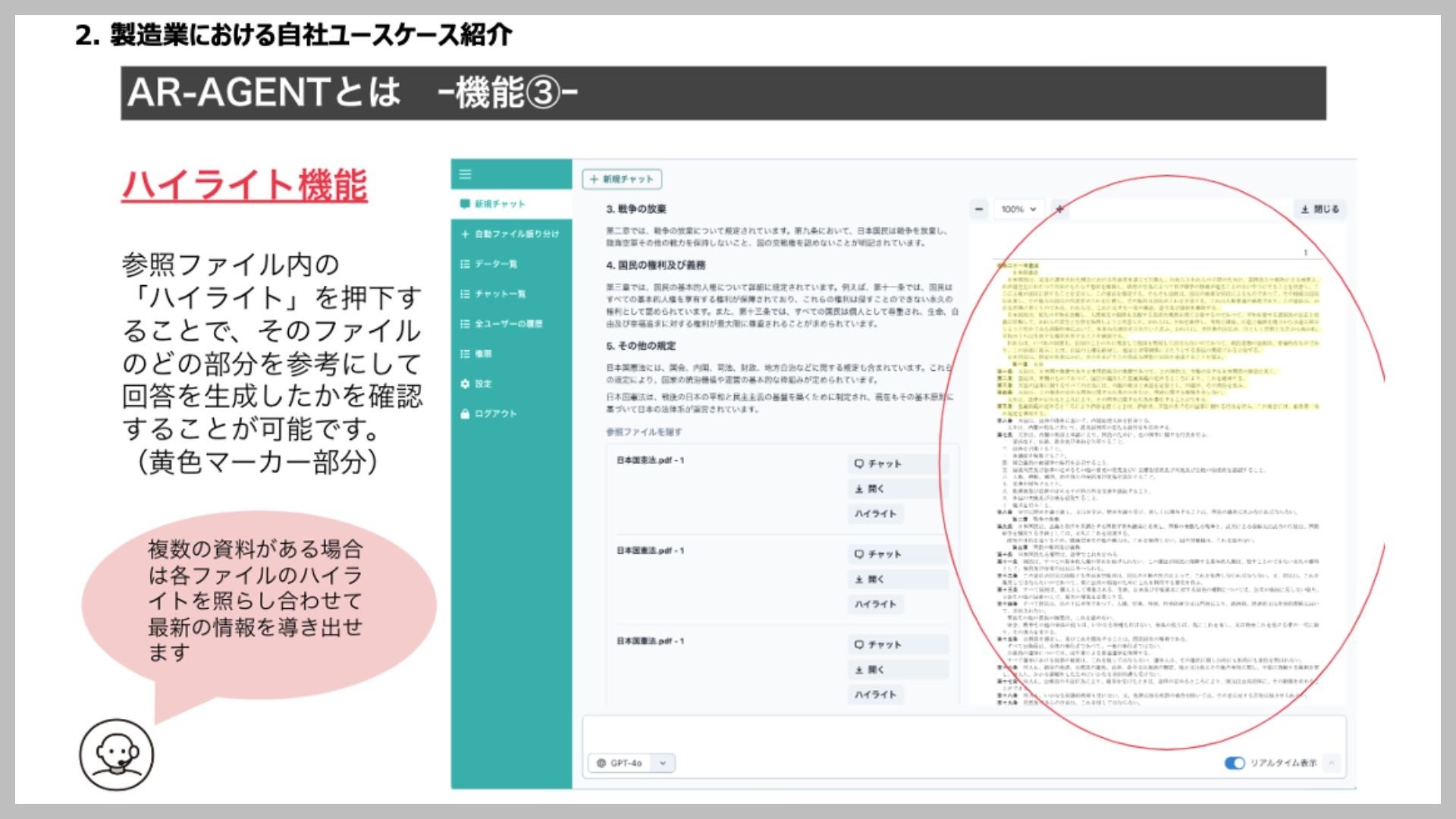 機能としては、タイトル・キーワード・AI検索の3種類の検索方法、チャット機能による資料検索と回答提示、そしてAIがどの部分を参照しているか確認できるハイライト機能があります。