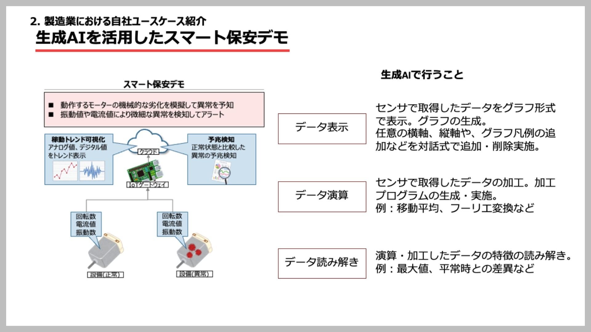 スマート保安デモは、生成AIを活用して製造業における機械の異常検知や予測保全を実現するものです。振動や電流値の異常を検知し、回転機械の動作異常を予測します。